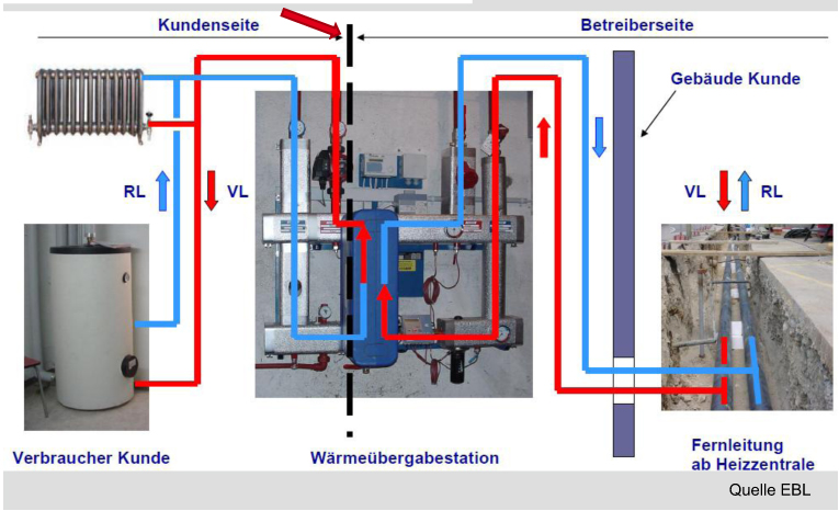 und über ein Rohrleitungsnetz den Kunden zum Heizen und zur Warmwasser-Aufbereitung